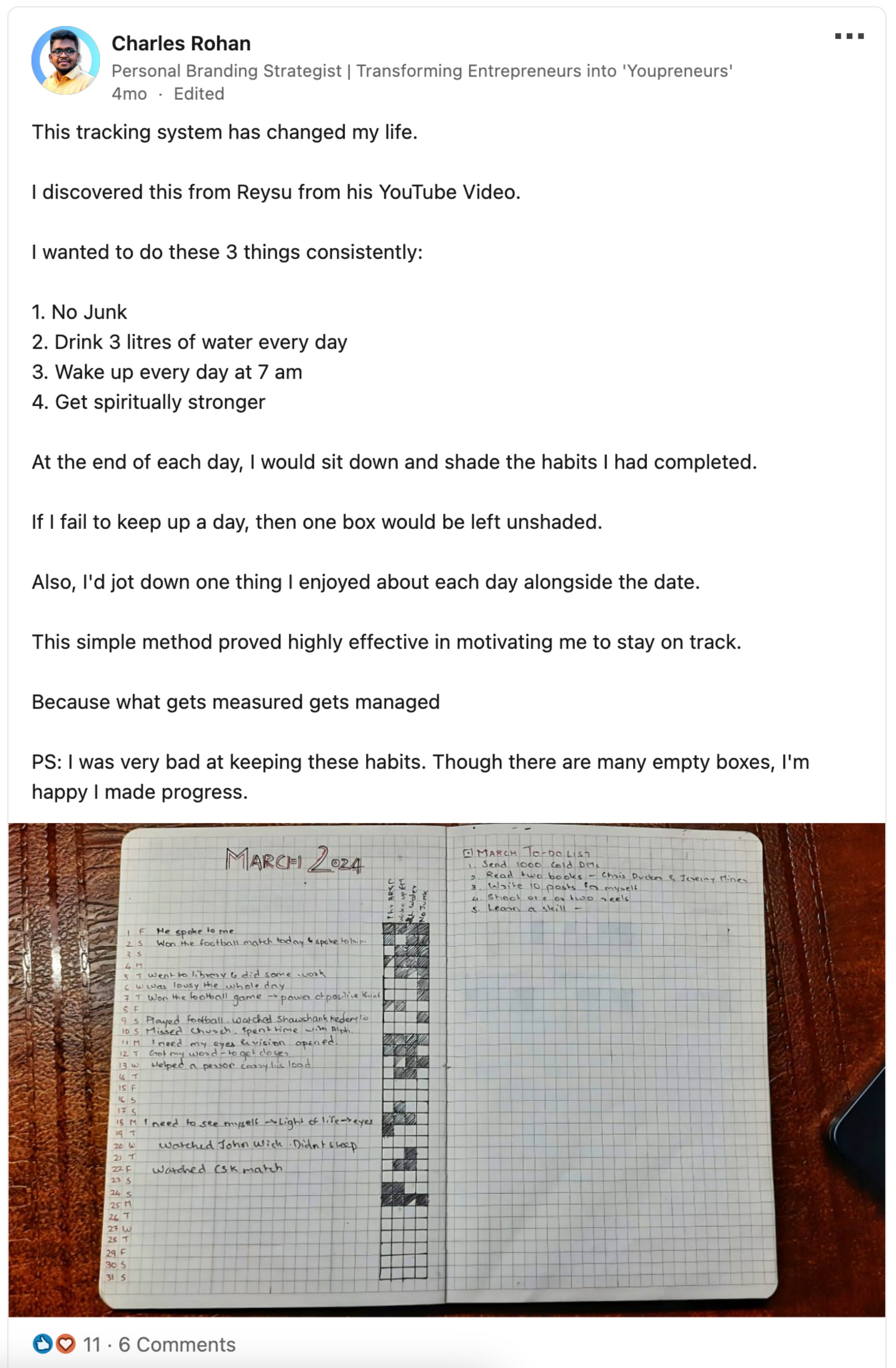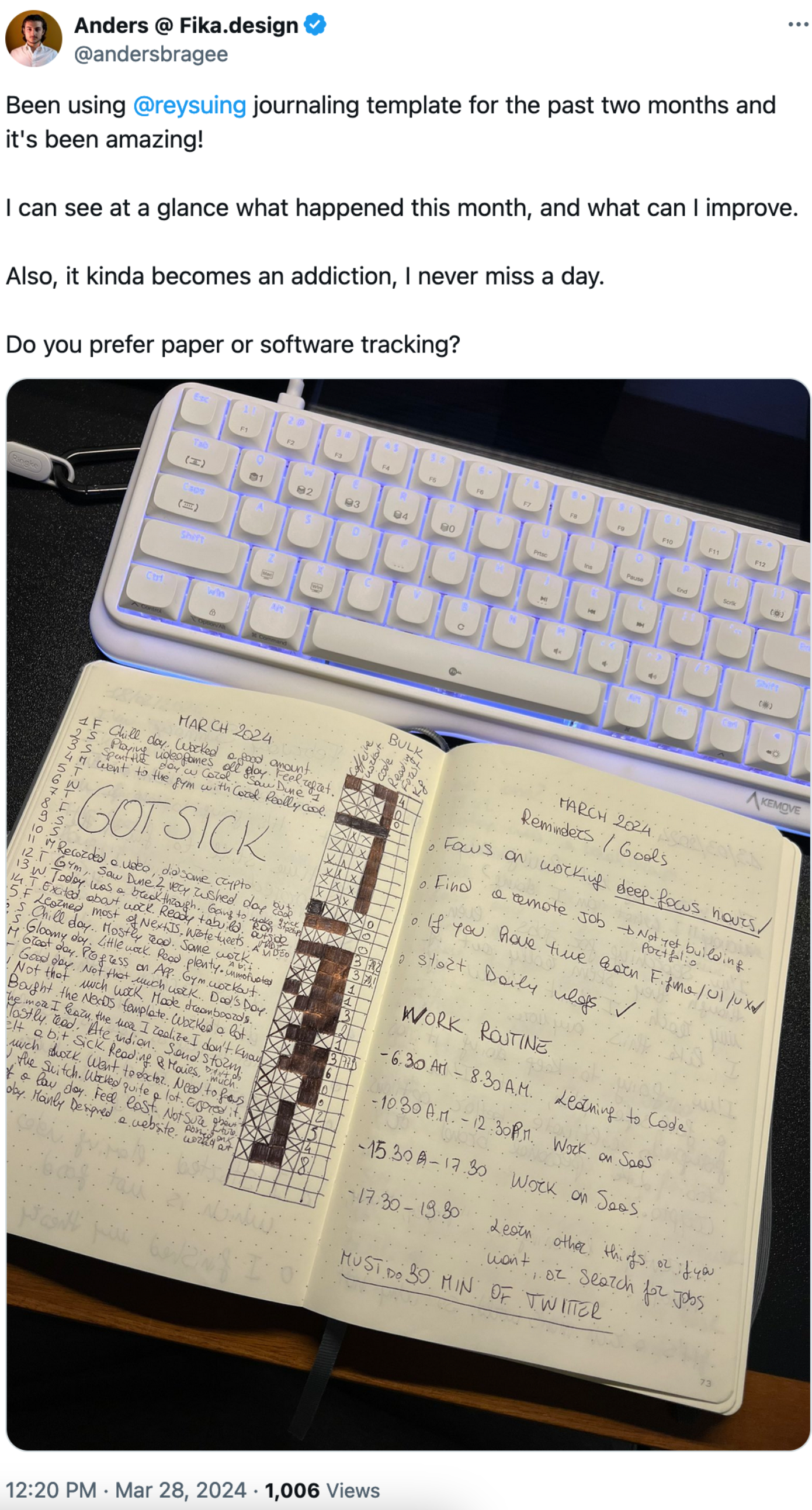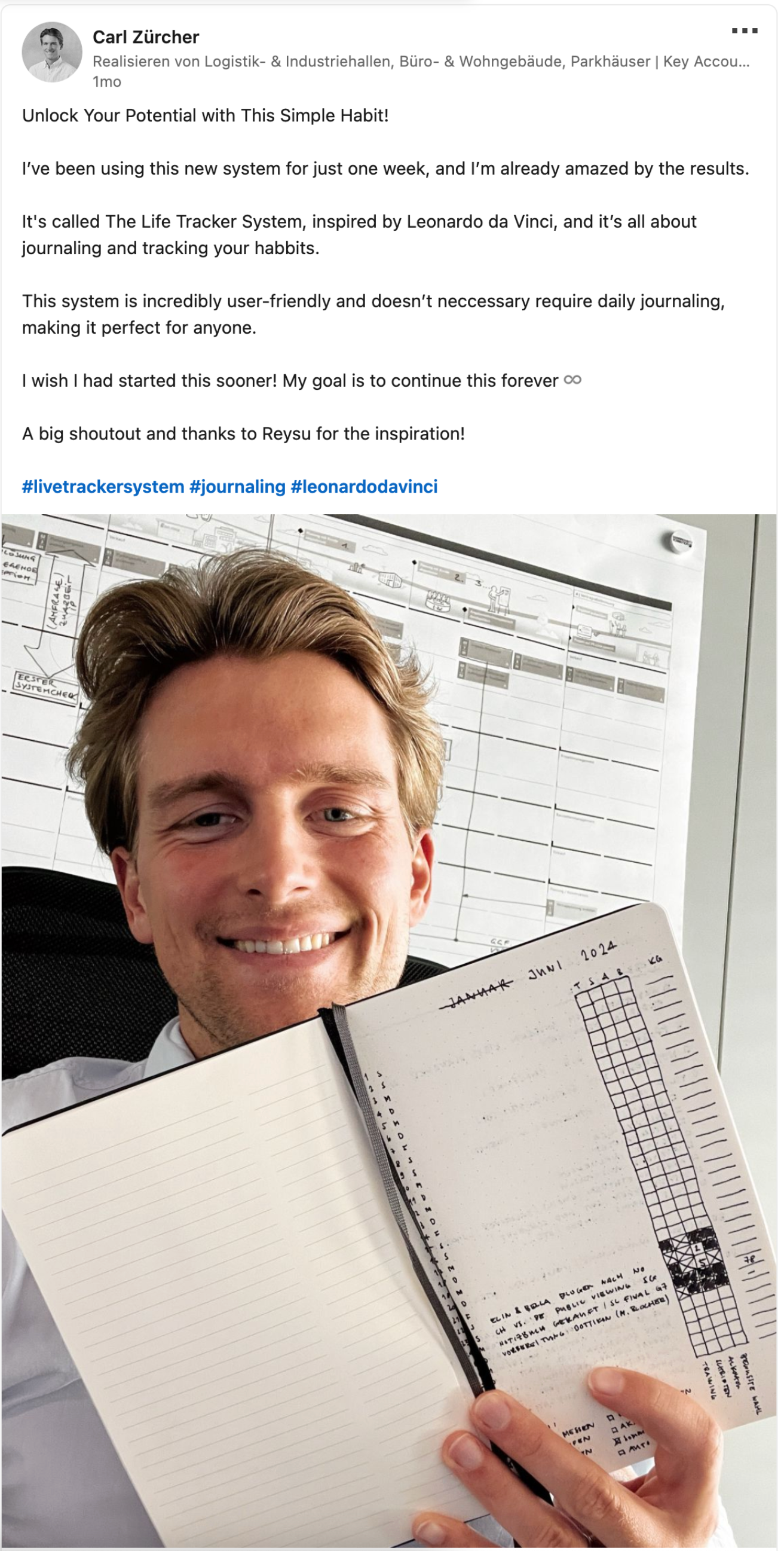 Even though Carl had only been using the system for one week before he made this post, he shared how much it has helped him in tracking his habits and making progress towards his goals. Love to see it!!