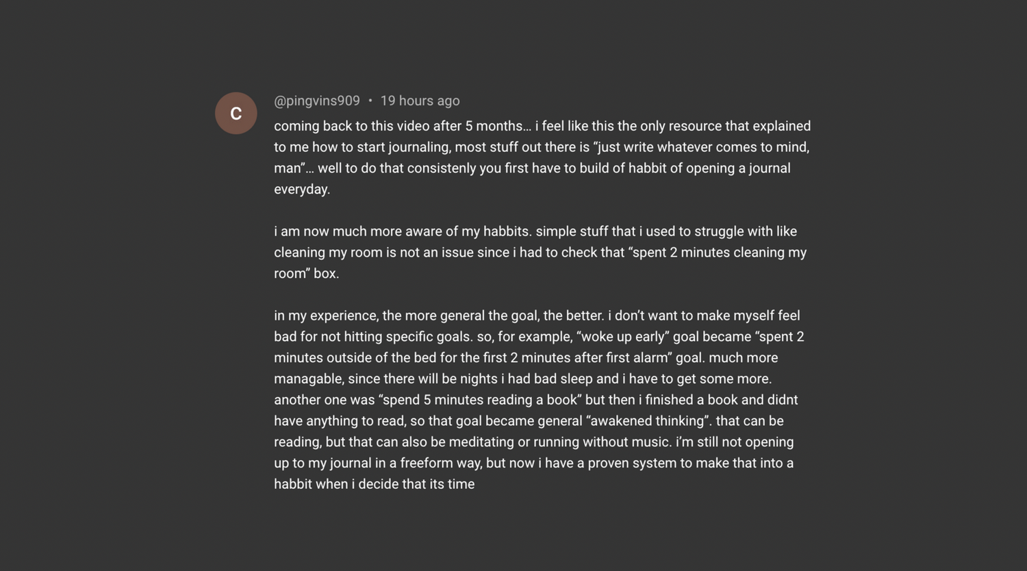 On YouTube, I get a lot of positive comments from people who are using the Life Tracker System every day. This one stood out to me because even after 5 months, Ping came back to this video and is how they learned to start journaling in the first place.